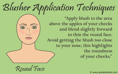 For a Round Face: Apply blush to the area above the apples of your cheeks and blend slightly forward to thin the round face. Avoid getting the blush too close to your nose; this highlights the roundness of your cheeks.